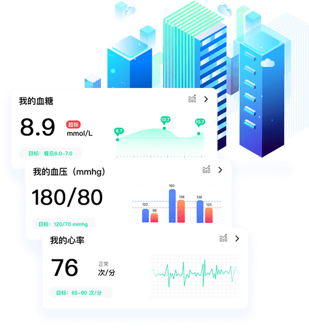健康模塊,飽含血糖、血壓、尿酸、心率以及運動健康指數,為用戶提供數據云儲存、健康預警。系統還可根據用戶平時的檢測指數,運算出健康目標值